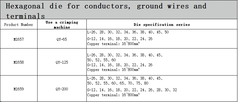 La matriz de engarzado hexagonal para conductores, cables de tierra y terminales es una herramienta de engarzado especial utilizada en la construcción y mantenimiento de líneas eléctricas, principalmente para las operaciones de engarzado de conductores, cables de tierra y terminales. Su diseño hexagonal garantiza que los puntos de engarzado tengan una distribución uniforme de la fuerza, proporcionando un excelente rendimiento de conexión eléctrica y resistencia mecánica, y es adecuado para diversas especificaciones de cables, cables de tierra y terminales.