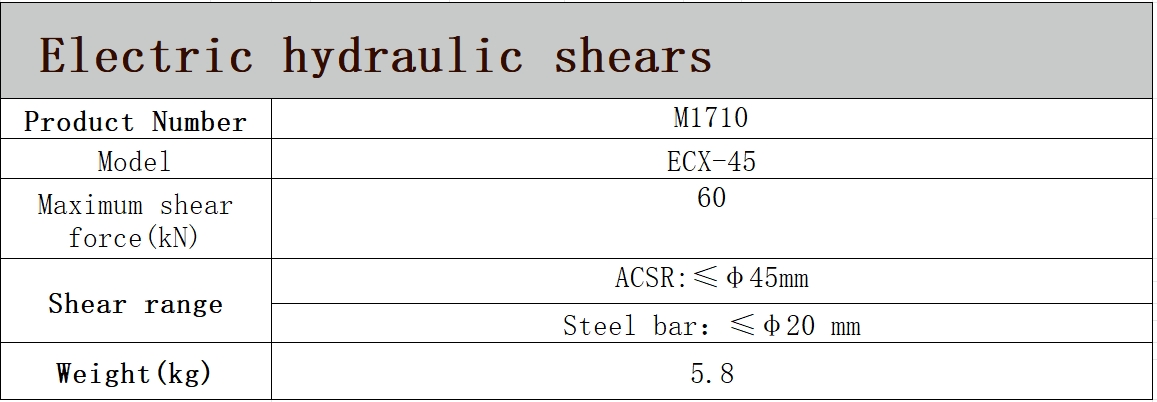 Las cizallas electrohidráulicas son herramientas de corte altamente eficientes que integran accionamiento eléctrico y tecnología hidráulica. Se utilizan principalmente para cortar alambres, cables, alambres de acero, etc. en industrias como la energía, las comunicaciones y el transporte. Sus componentes principales incluyen motores eléctricos, bombas hidráulicas, cilindros hidráulicos, cuchillas y sistemas de control, etc., que pueden proporcionar operaciones de corte eficientes y precisas.
